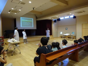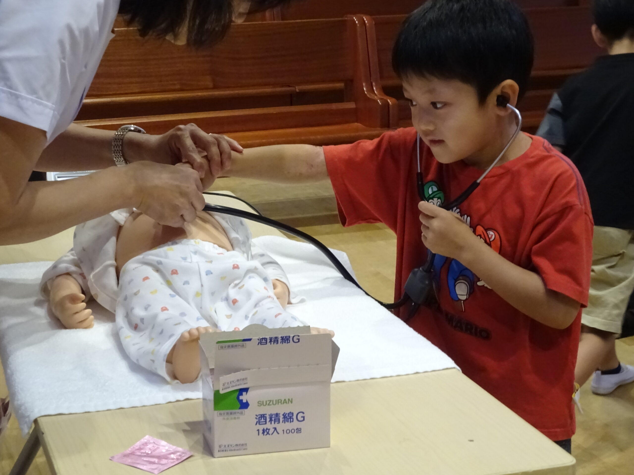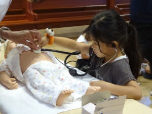 関東学院大学看護学部の先生が来て下さり、年長組は看護体験をしました。「お腹の音ってどんな音だろう」お腹の中には胃や腸があり食べた物を消化して身体に栄養を送っていることを教えてもらい、その後実際にお人形のお腹の音を聴診器でききました。子どもたちは、とても真剣に「音」をきいていました。