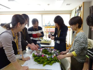 相川先生と一緒に保護者のボランティアの方々と、クランツとリースを作りました!相川先生から色々と教えて頂きながら和気あいあい楽しい時間となりました。作っている間も、針葉樹の香りが漂い保護者の方々も喜んでいました。素敵なクランツとリースをありがとうございました!