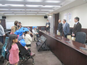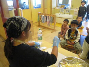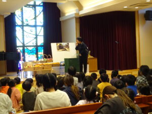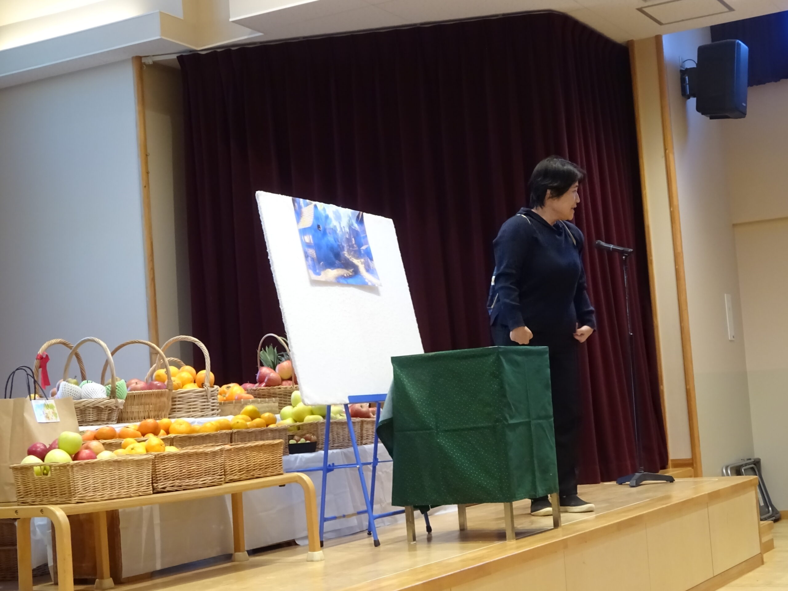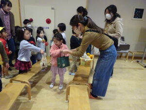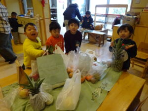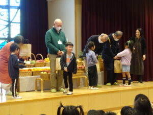 神さまの恵みに感謝し、その恵みを分かち合う収穫感謝礼拝をお捧げしました。お家から持ってきた果物。子どもたちは、嬉しそうに袋から出していました。ホールに集い、その恵みに感謝し、普段お世話になっている方々(バスのドライバーさん、園庭アトリエ活動の指導をして下さっている照沼先生、こども園の守衛さん)に子どもたちから持ち寄った果物をお渡ししました。また、礼拝後も各クラスに別れお世話になっている方々へ果物を渡しに出かけました。