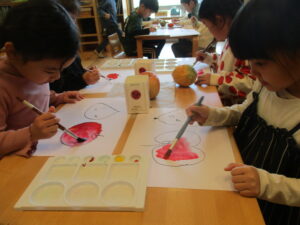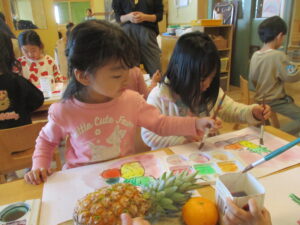 年長組は、果物を見ながら絵をえがきました。描いているうちに、夢中になる子どもたち。お昼の時間になっても続けている姿もあり、楽しさが伝わってきました。