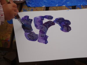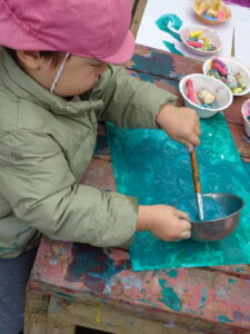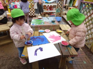 絵の具を出し始めると、自分で好きな色を選び紙皿で混ぜ合わせ「これだ!」と思った色でアクリル板や紙に心の感じるままに腕を動かしていました。心も身体も開放され、夢中の子どもたち。。。。また、やろうね!