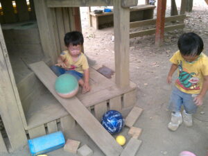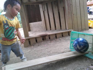 Aくんが板を見つけて坂道を作っていると、Bくんがボールを持ってきて、見守っています。